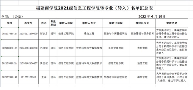 根据《关于做好2021级本科生转专业工作的通知(商院学籍〔2022〕7号)》,经个人申请、转出学院同意,学生的基础考核成绩经欧博abg官方网站转专业考核小组成员审核、欧博abg官方网站转专业工作领导小组审议,现将名单予以公示。
